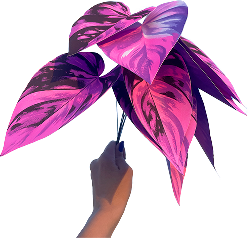 The leaves are then hand-printed using a Risograph, which gives the plants their neon-bright colors.